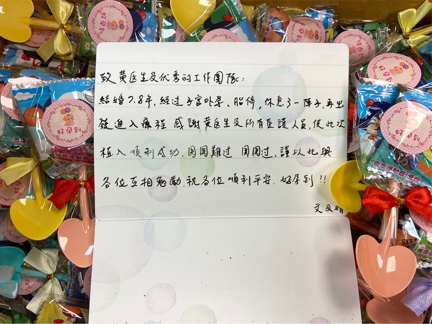 結婚7.8年經過子宮外孕、胎停、休息了一陣子再出發進入療程,感謝黃醫生及所有醫護人員,使此次植入順利成功