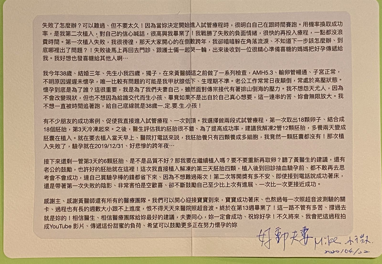 感謝黃醫師還有所有醫療團隊,寶寶成功著床,我們可以開心迎接寶寶到來