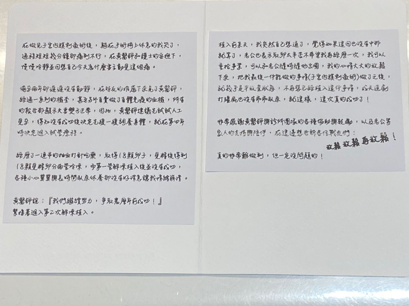 非常感謝黃醫師與診所團隊各種協助與鼓勵,已及老公等家人的支持與陪伴,在這邊想告訴各位戰友們: