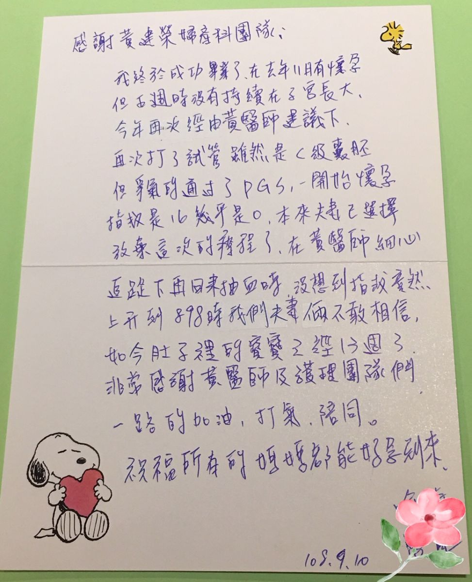 我終於成功畢業了,在去年11月有懷孕但五週時沒有持續在子宮長大,今年再次經由黃醫師建議下再次打了試管,雖然是c級囊胚,但爭氣地通過了PGS,一開始懷孕指數是16幾乎是0,本來夫妻已選擇放棄這次療程了,在黃醫師細心追蹤下再回來抽血時,沒想到指數竟然上升到898時我們夫妻倆不敢相信,如今肚子裡的寶寶已經13週了,非常感謝黃醫師及護理團隊們,一路的加油、打氣、陪同。