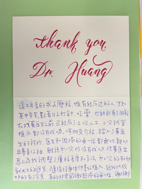 這2年多的求子歷程,惟有經歷過的人才知道其中辛苦。數著日子打針、吃藥也終於有了回報。在找黃醫生之前已經利2次人工、2次試管植入都沒有成功。聽朋友介紹,踏入黃醫生的診所,醫生和團隊的每一位都無比親切且專業仔細,雖說第一次仍沒有成功,但黃醫生馬上為我調整了療程長度和方法,第二次的取卵就大大的進步,雖後待身體休養好植入,讓我們成功的有了寶貝,真的非常感謝團隊的每一位,謝謝。